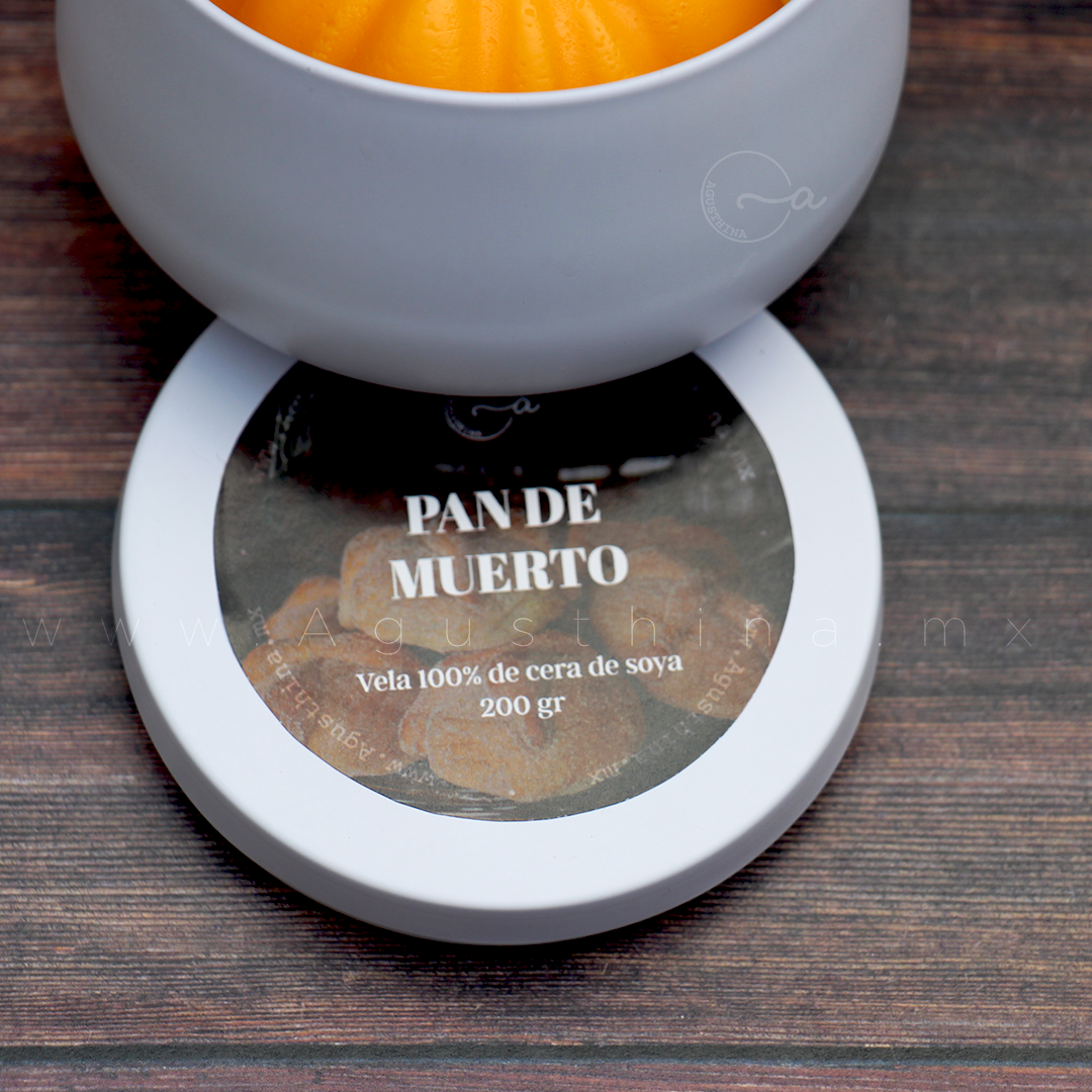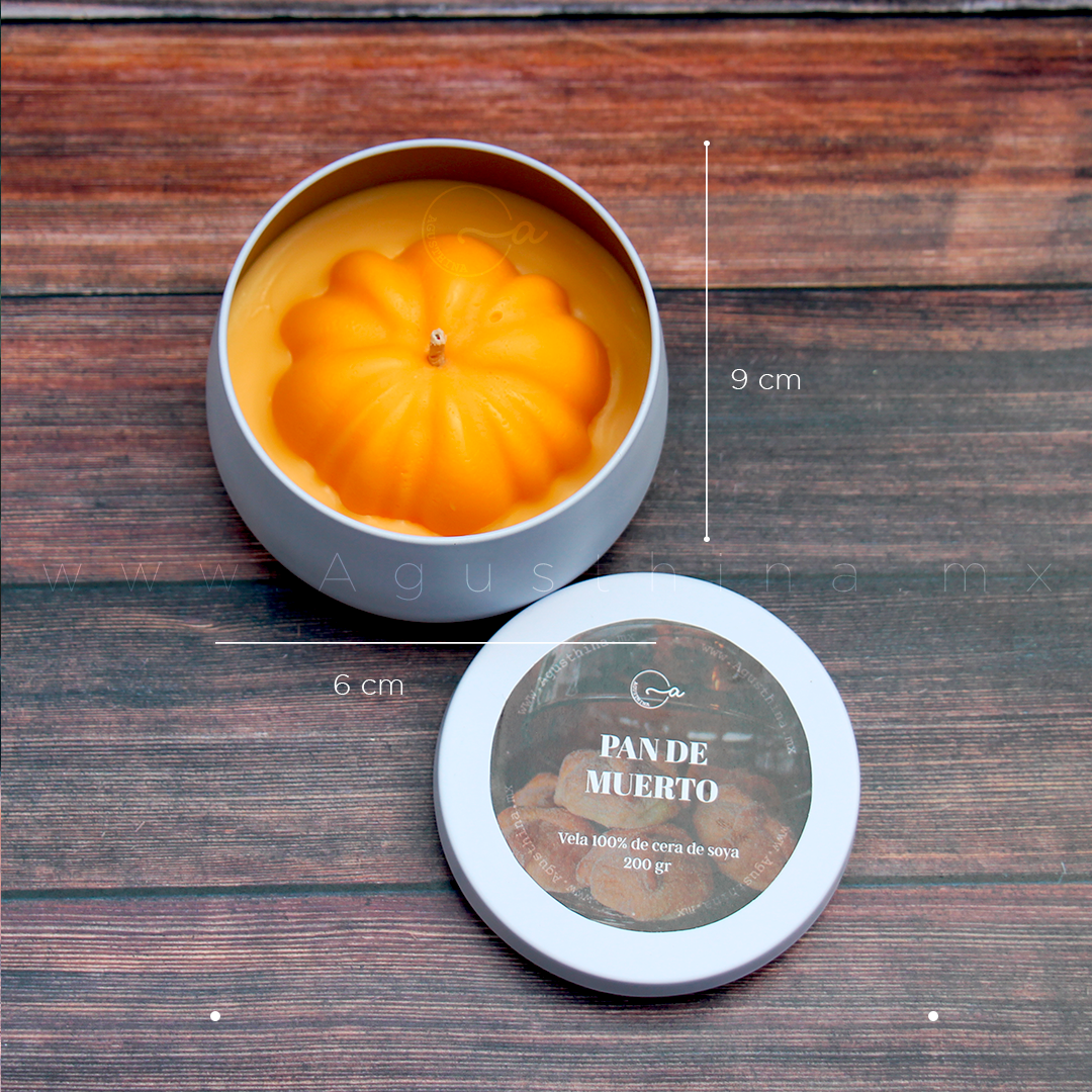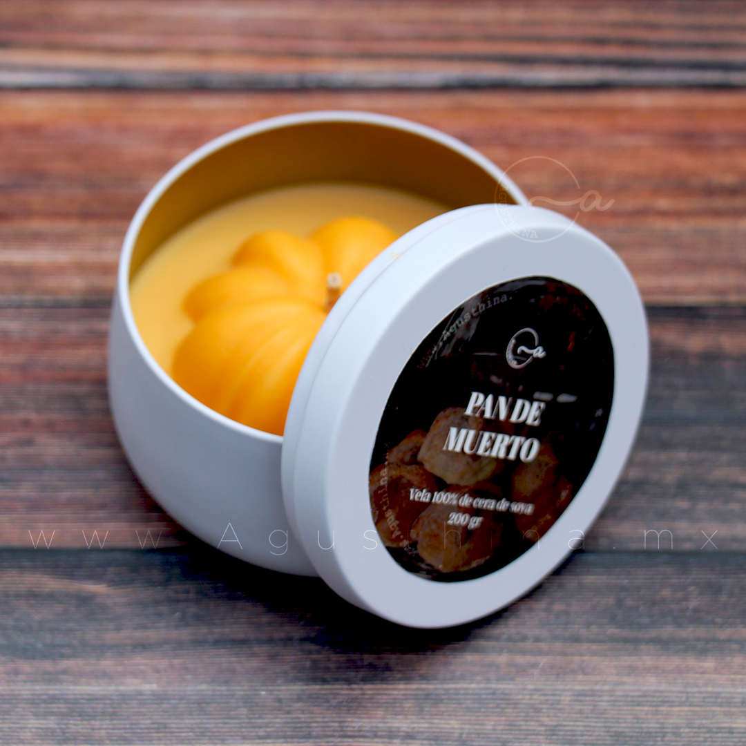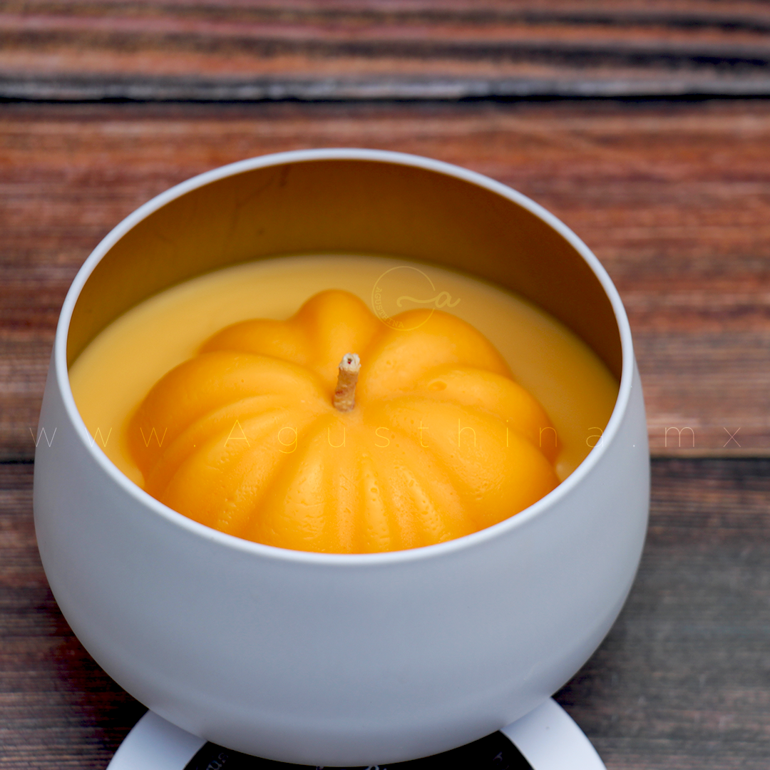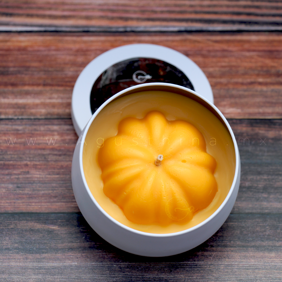 Vela en lata con calabaza adentro (el color de la calabaza es naranja).